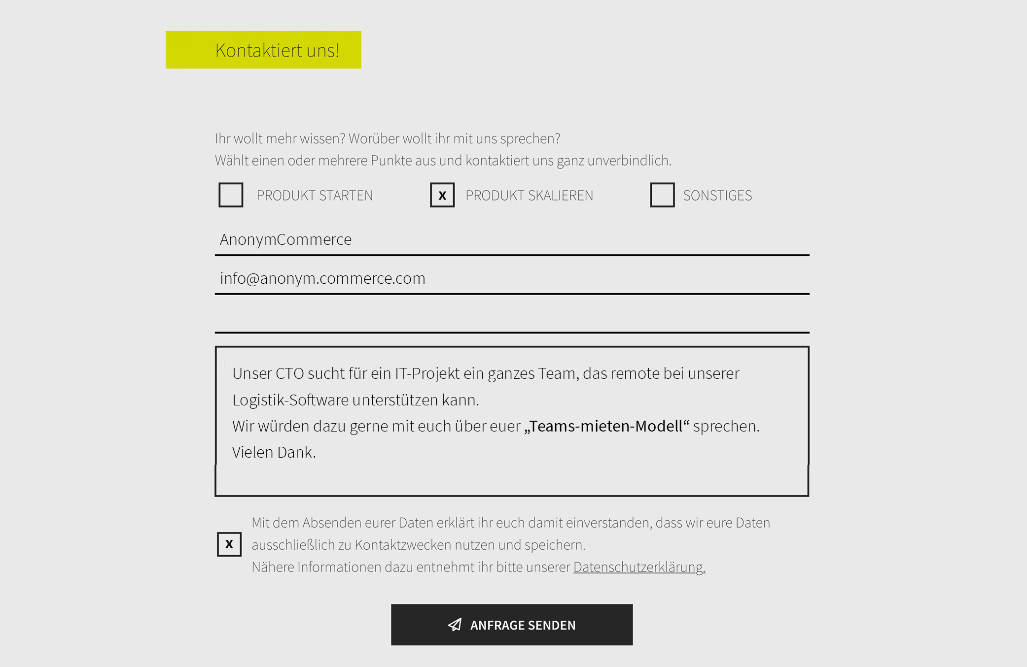 Eine mittelständisches E-Commerce-Unternehmen begann 2020 damit, die Logistik für eines ihrer Kernprodukte von Grund auf neu zu entwickeln. Die Verantwortlichen merkten nach einiger Zeit, dass sie mehr Schlagkraft und React-Technologieexpertise brauchen. Für beides war unser „Teams mieten“-Konzept wie gemacht. Und aufgrund einer sportlichen Deadline mussten wir dann auch direkt Vollgas geben. Auf dem Weg gab es dann sogar Lob aus einer unerwarteten Richtung ...