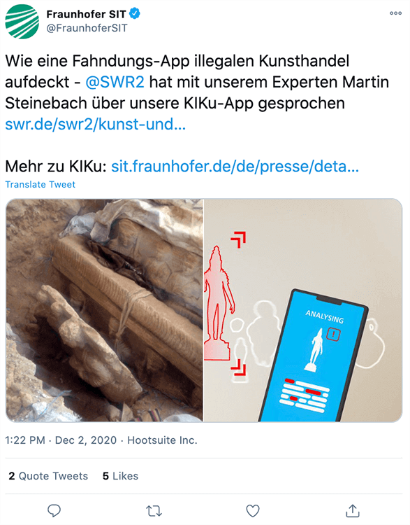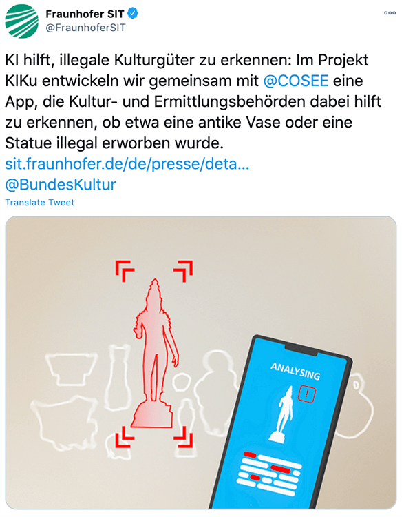 Kulturgüter wie antike Münzen, Vasen, Figuren, Waffen und Fossilien werden immer wieder gestohlen und geschmuggelt. Oft passiert der Diebstahl in Form von Raubgrabungen direkt an den historischen Stätten. Damit sind die Güter nirgendwo durch einen Experten erfasst worden. Gleichzeitig sind diese Güter für einen Beamten beim Zoll oder bei der Polizei nur schwer zu erkennen und von legalen Objekten zu unterscheiden. Das Fraunhofer SIT als Projektpartner und cosee kombinieren ein Deep-Learning-Netz und eine App, um dieses Problem zu lösen.